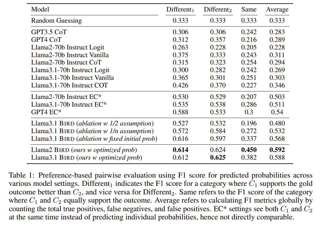 이 테이블은 BIRD와 다른 모델들(GPT, LLaMA 등)의 성능을 F1 점수 기준으로 비교합니다. 각 모델은 특정 상황에서 예측 확률을 기반으로 최적의 결과를 도출하려는 목표를 가지고 있으며, BIRD가 기존 모델 대비 얼마나 우수한 성능을 발휘하는지를 보여줍니다.