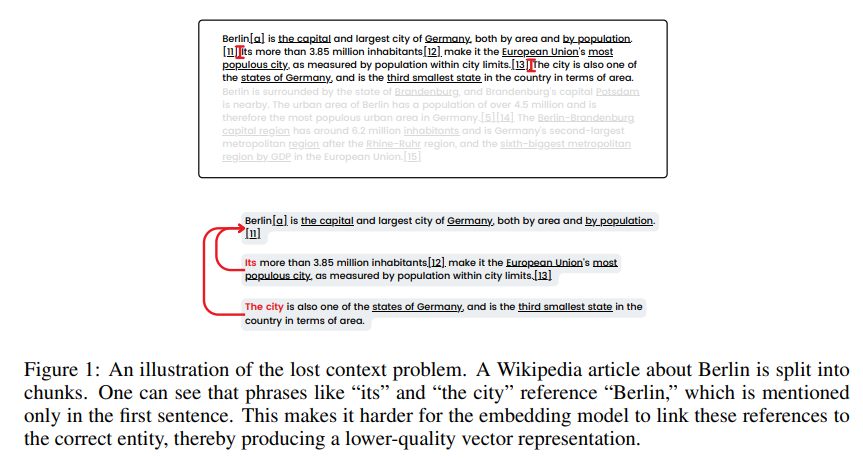 이 Figure는 Naive Chunking의 한계를 강조하고, Late Chunking이 문맥 보존을 통해 더 나은 임베딩 품질을 제공할 수 있음을 시각적으로 설명합니다. 즉, "its"와 "the city" 같은 참조 표현이 적절히 연결되기 위해서는 문서 전체의 문맥을 반영한 임베딩 생성이 필수적임을 보여줍니다.