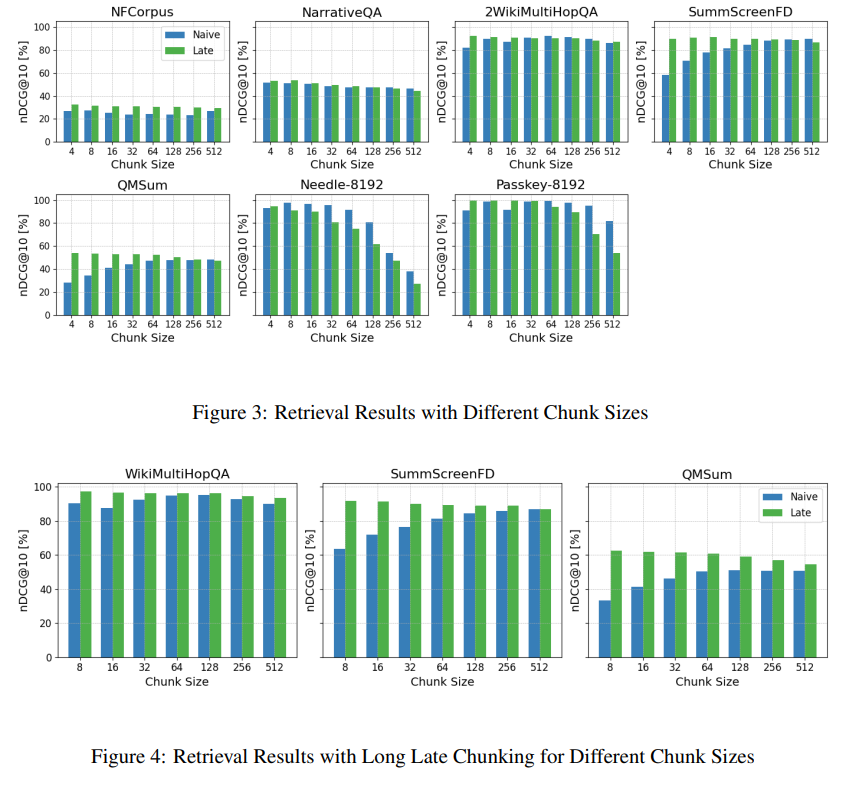 이 두 개의 Figure는 Naive Chunking과 Late Chunking의 성능을 서로 비교한 결과를 보여주며, 특히 청크 크기에 따른 정보 검색 성능 변화를 나타냅니다. 또한, Long Late Chunking이 긴 문서를 처리할 때의 효과도 설명하고 있습니다.