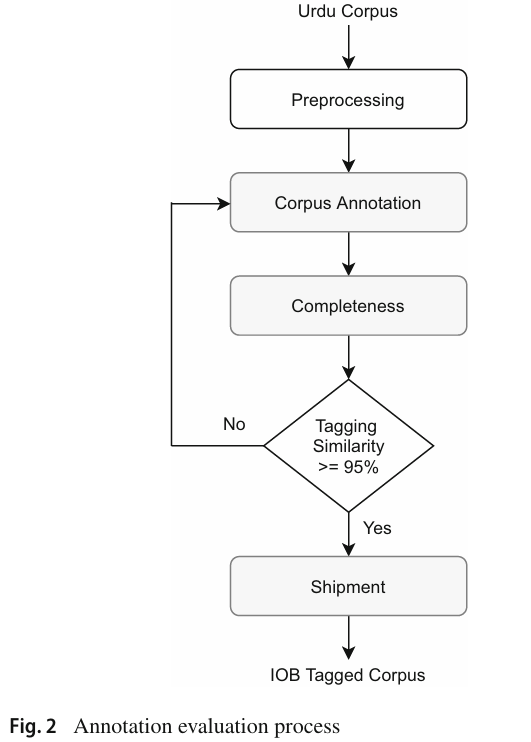 이 그림은 우르두 코퍼스 주석화의 평가 과정을 단계별로 나타내며, 데이터 품질을 보장하기 위해 반복적으로 검증하고 수정하는 절차를 강조합니다. 각 단계의 역할과 연결 관계를 아래에 설명합니다.
