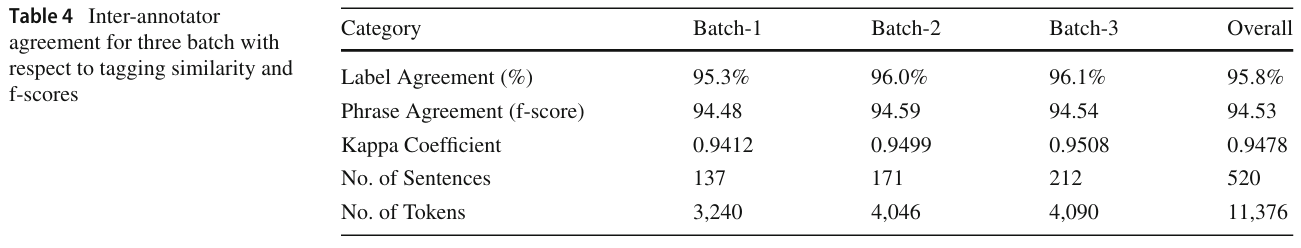 이 테이블은 주석자 간의 일치도(inter-annotator agreement)를 평가한 결과를 나타내며, 데이터의 신뢰성과 주석 품질을 검증하는 데 중요한 지표를 제공합니다. 각 Batch별로 다양한 평가 지표가 제시됩니다.