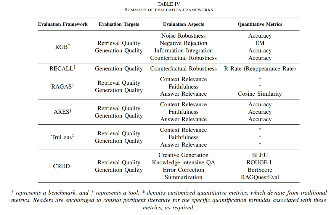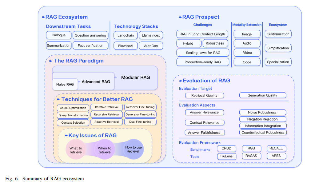 | 연구 패러다임 | 1. Naive RAG: 단순한 Retrieve-Read 구조 2. Advanced RAG: 검색 전후 과정 최적화 (예: 쿼리 확장, 청크 압축) 3. Modular RAG: 모듈화된 구조로 유연성, 적응성 증대 (예: 새로운 모듈 추가, 반복적 검색) |