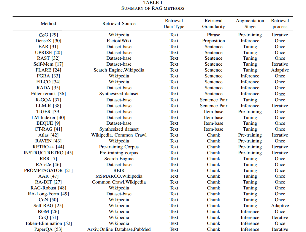 TABLE I: Summary of RAG Methods