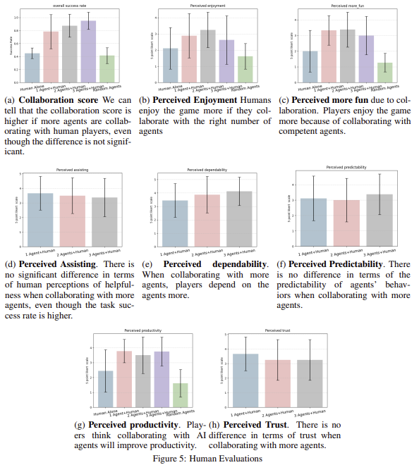| 인간-AI 협업 분석 | - 인간 플레이어는 적정 수의 에이전트(2~3명)와 협업 시 가장 높은 재미와 효율성을 경험 - 에이전트가 많아질수록 생산성 증가, 하지만 팀 재미와 몰입도는 감소 - 에이전트 행동의 예측 가능성 및 신뢰도는 안정적 유지 |