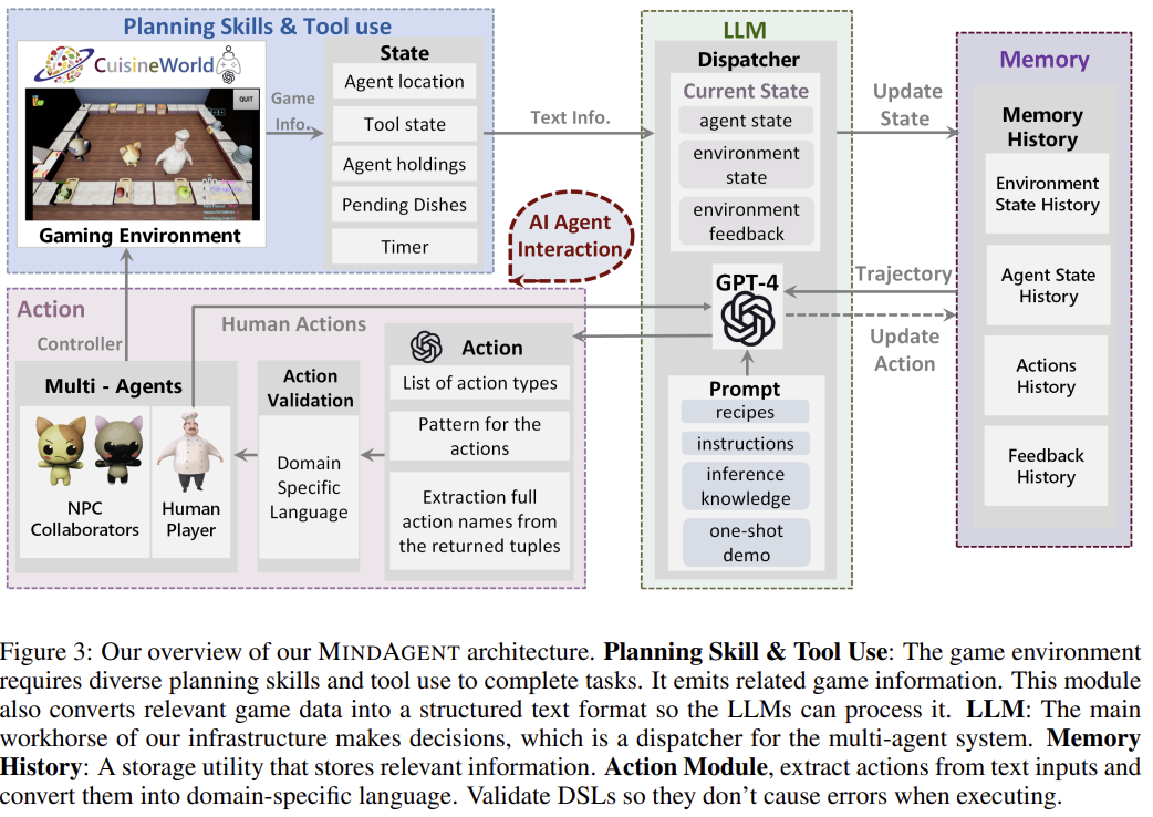 | MINDAGENT 아키텍처 | 1. Gaming Environment: 상태(State) 정보 제공 2. LLM: 작업 계획 및 조정 담당 3. Memory Module: 과거 기록 저장 및 학습 4. Action Module: 행동 검증 및 실행 관리 |