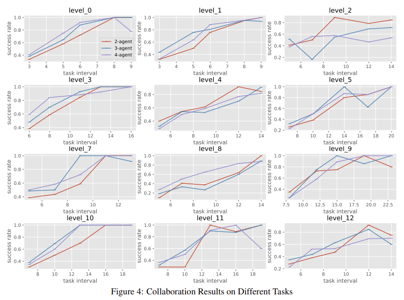 - 협업 에이전트의 수가 많아질수록 작업 성공률이 높아짐