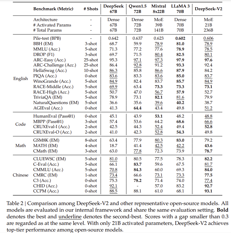 MLA와 DeepSeekMoE는 메모리 사용량 감소, 추론 속도 향상, 훈련 비용 절감을 동시에 달성. - 강력한 성능: