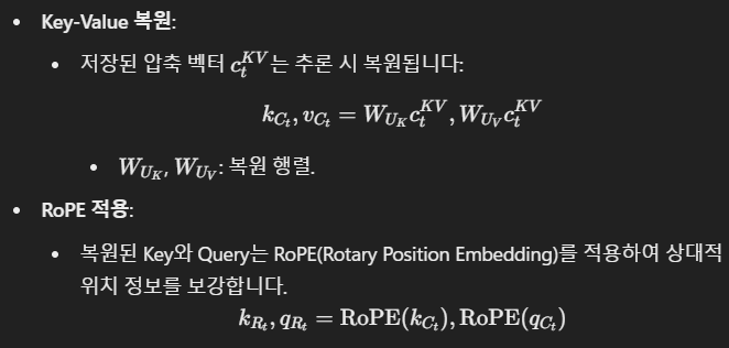 - MLA와 RoPE의 결합을 통해 긴 컨텍스트에서도 높은 성능을 유지.