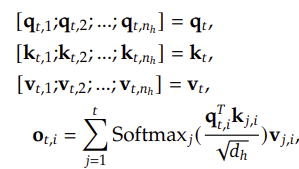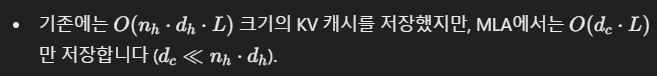 - Multi-Head Latent Attention(MLA)을 적용하여, KV 캐시를 압축해 훈련 메모리와 계산 비용 감소.