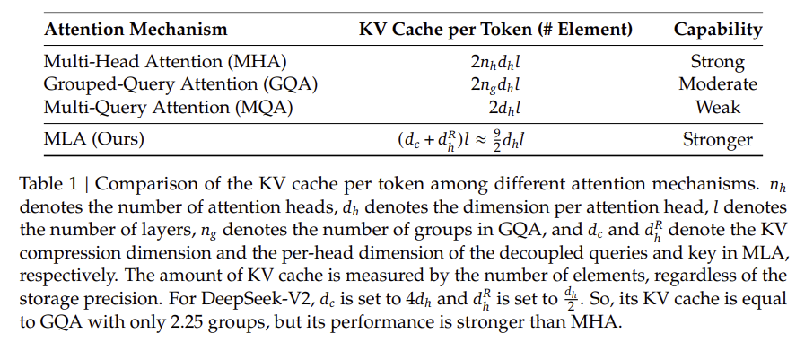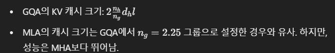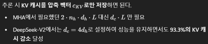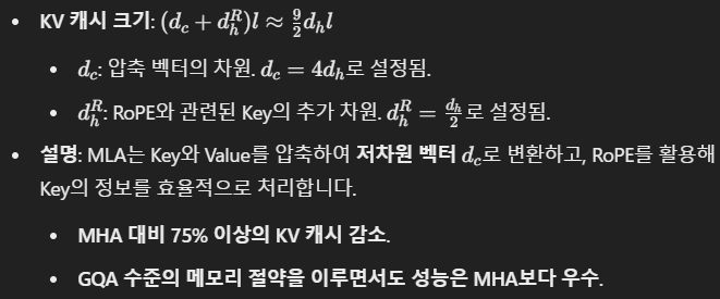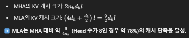- MLA(Multi-Head Latent Attention)를 통해 KV 캐시 크기를 기존 MHA 대비 93.3% 감소.
