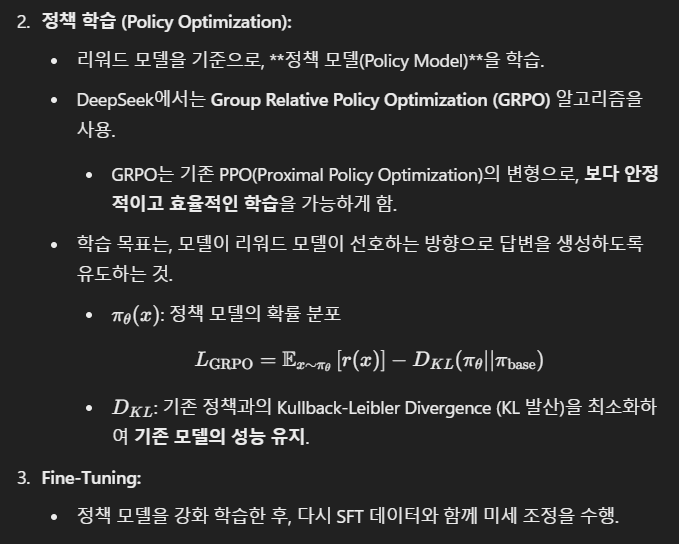 | Alignment (정렬) | - Supervised Fine-Tuning (SFT): 1.5M 명령어 튜닝 데이터로 학습. - 안전성(Safety)과 유용성(Helpfulness) 개선. - 수학, 코딩, 언어 작업 수행 능력 강화. - Reinforcement Learning with Human Feedback (RLHF): Group Relative Policy Optimization (GRPO)을 사용해 정책 모델 최적화. - 사람이 선호하는 응답 생성 및 정렬 품질 개선. |