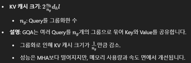 | KV 캐시 크기 감소율 | 93.3% | 감소 없음 | 약간 감소 | 감소 없음 |