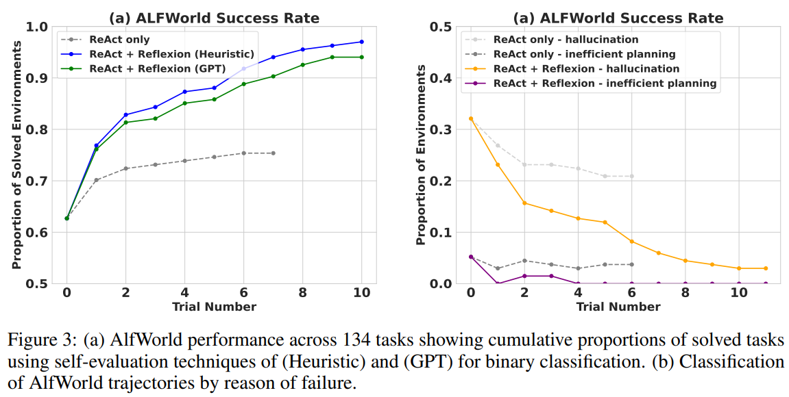 이 Figure는 Reflexion이 단순한 강화 학습 방식이 아니라, 인간과 유사한 학습 패턴(반복적인 자기 개선)을 통해 지속적으로 발전할 수 있음을 잘 보여준다.