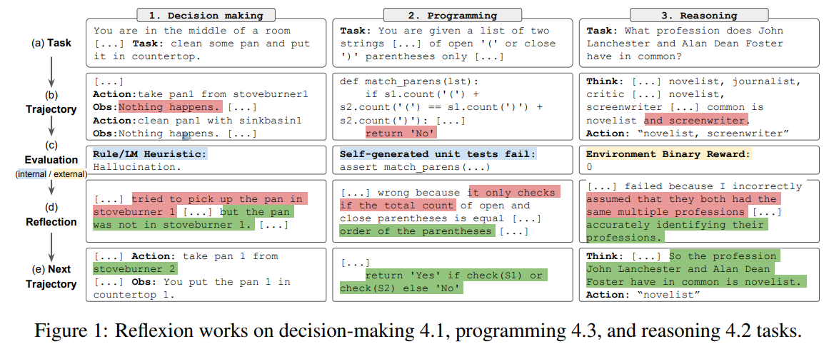 이 Figure는 Reflexion 프레임워크가 세 가지 주요 작업 유형에서 어떻게 작동하는지를 시각적으로 설명한 것이다. 각각의 작업은 의사 결정(Decision Making), 프로그래밍(Programming), 그리고 추론(Reasoning)을 포함하며, Reflexion이 각 작업에서 어떻게 개선되었는지를 단계별로 보여준다.