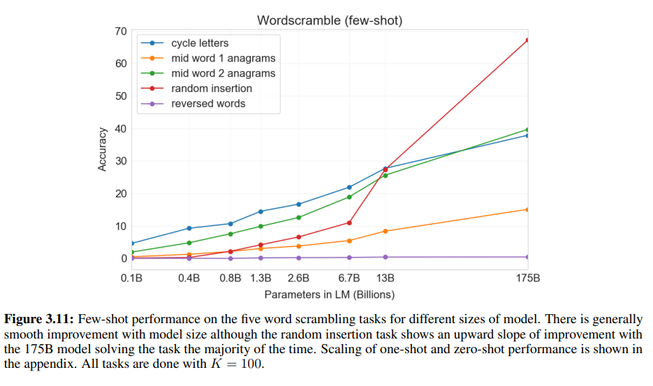이 Figure를 보면 175B가 넘어야 Few-Shot의 성능이 확실하게 보이는 것을 볼 수 있습니다.