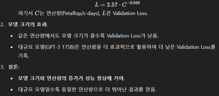 | 모델 크기와 성능 관계 | - 모델 크기와 학습 데이터가 증가할수록 Validation Loss가 전력 법칙(Power Law)을 따라 감소. - 175B 모델은 작은 모델에 비해 더 효율적으로 학습하고 더 낮은 Loss를 기록. |