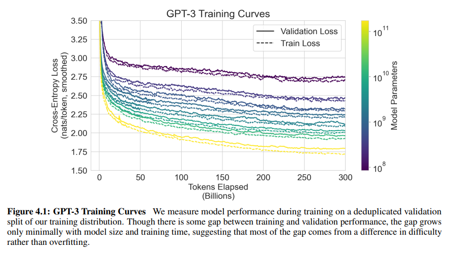 - 더 큰 모델(GPT-3 175B)은 동일한 학습 데이터에서 더 낮은 Loss를 기록.