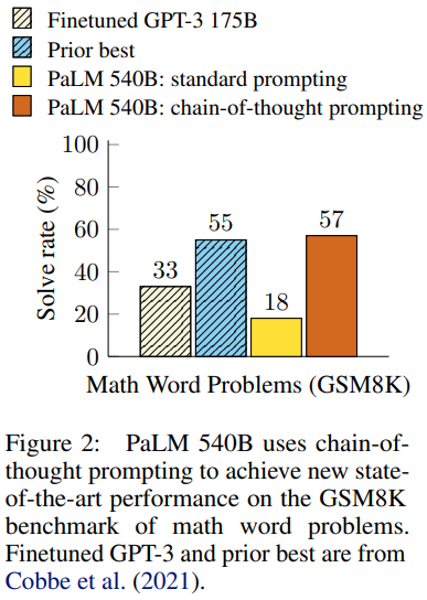이 Figure에서 보면 알 수 있든 Standard Prompting(기존의 Few-Shot)은 성능에 한계가 있었고, CoT를 통한 Prompting을 진행하니 SOTA를 달성한 것을 볼 수 있습니다.