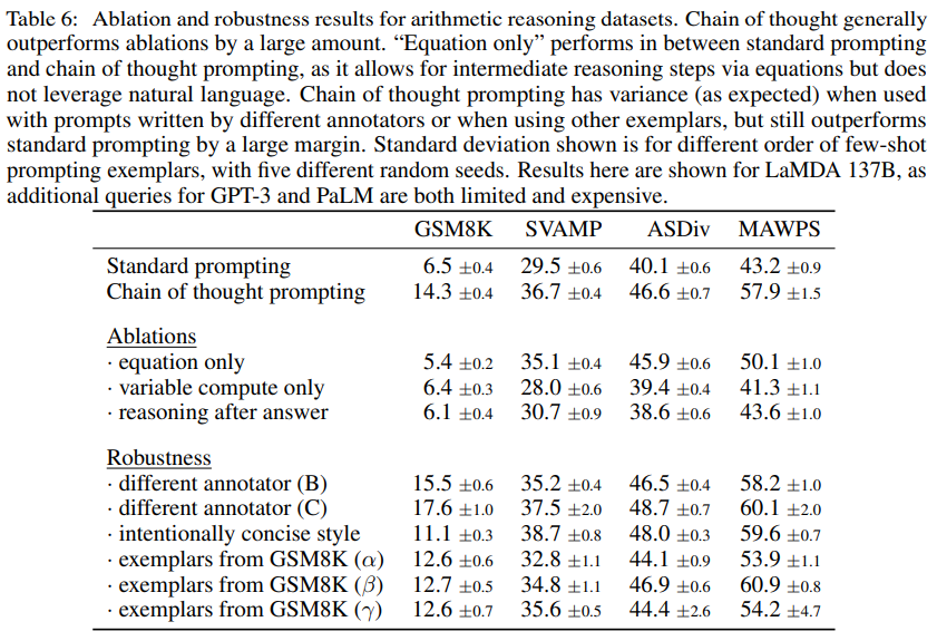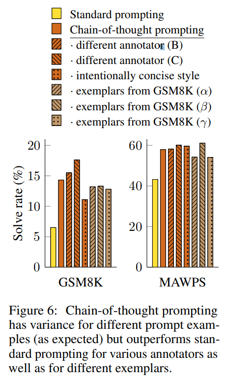 - Annotator A, B, C가 각각 다른 스타일로 Chain of Thought를 작성했음에도, 모든 경우에서 기본 Prompting(Standard Prompting)보다 높은 성능을 기록.
