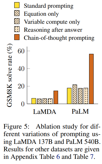 단순히 계산 자원을 늘리거나 출력 방식을 바꾸는 것만으로는 CoT가 가져오는 성능 향상을 재현할 수 없다는 점에서, CoT의 혁신적인 가치를 확인할 수 있습니다.