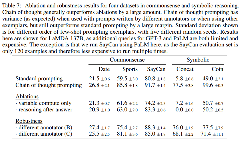 - CoT는 상식(Date, Sports, SayCan) 및 기호(Symbolic) 문제에서도 우수한 성능을 보임.