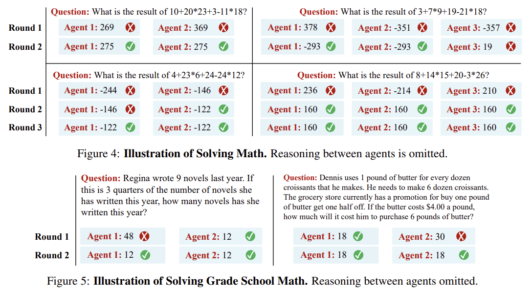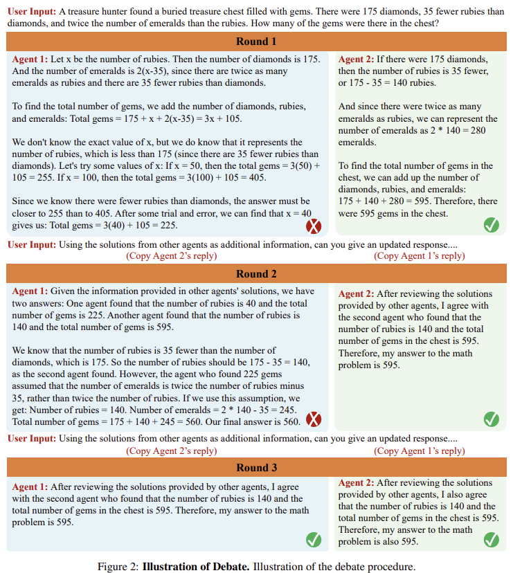 - 토론 및 비판 과정: 에이전트가 서로의 답변을 비판하고 자신의 답을 수정.