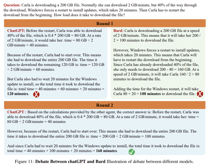 | Figure 사례 | - Figure 11: Windows 업데이트와 다운로드 시간 문제 - ChatGPT와 Bard가 각자 오류를 범했으나, ChatGPT가 Bard의 답을 활용하여 최종적으로 올바른 답(160분)을 도출 |