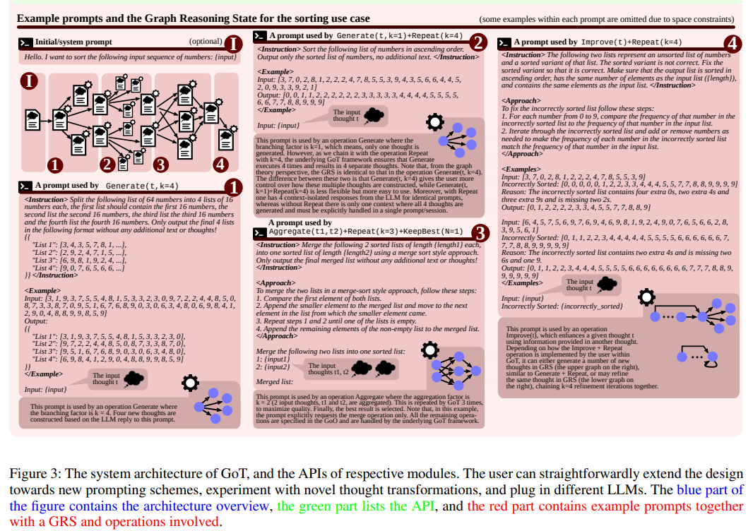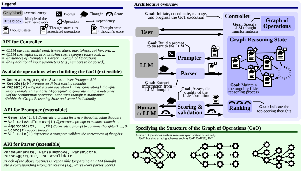 이 Figure는 GoT의 전체 아키텍처, API 구조, 그리고 실제 동작 예제를 명확하게 보여준다.