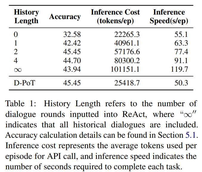 - 실험 결과, ReAct는 최적의 역사 길이가 2일 때 가장 높은 정확도를 보였지만, 이후 길어질수록 성능이 감소