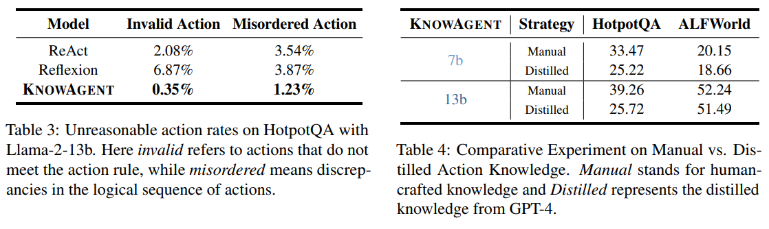 - KNOWAGENT는 액션 지식베이스(Action KB)를 활용하여, LLM의 계획(Planning) 단계에서 허용 가능한 액션 전이를 명확히 제시함으로써 에이전트의 논리적 일관성을 높이는 데 성공했습니다.