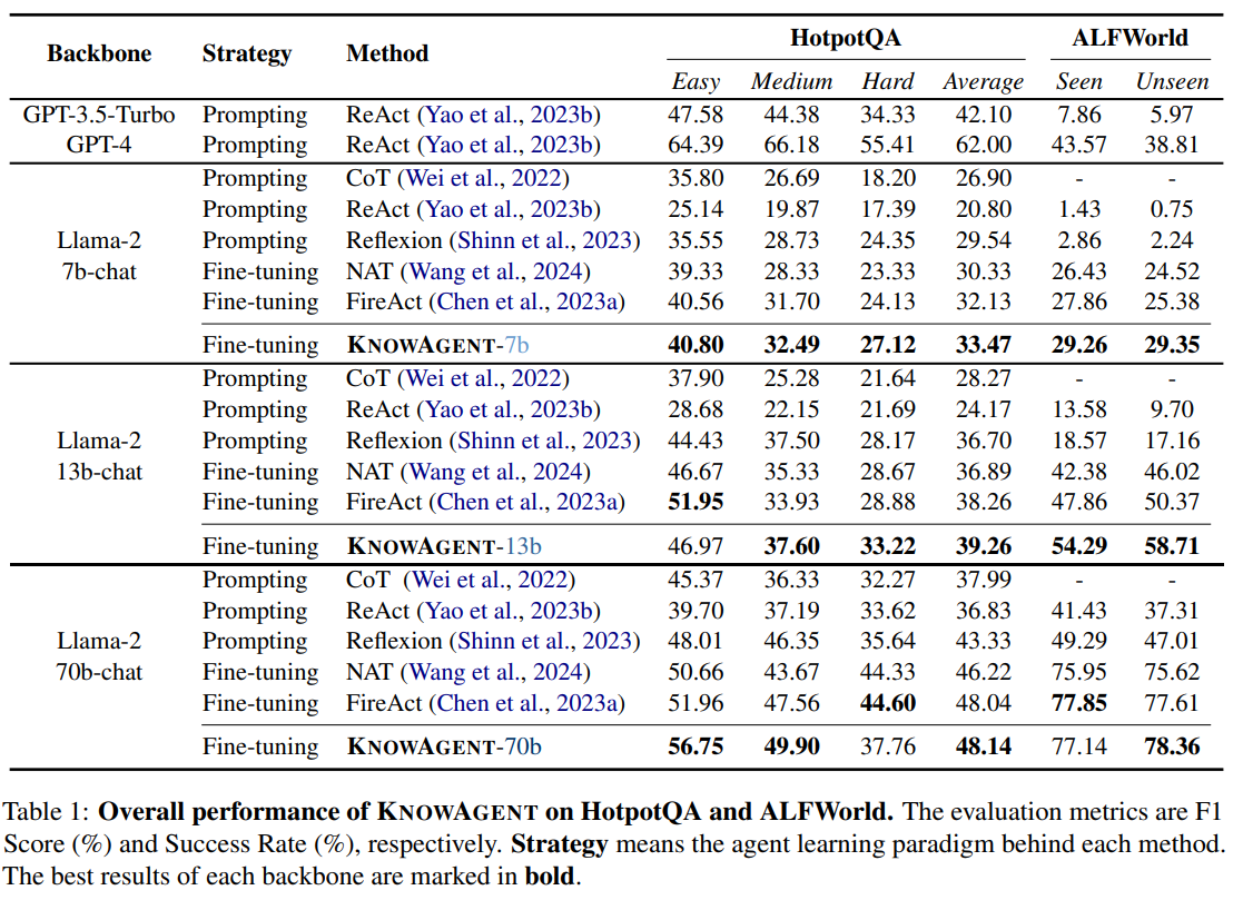 논문에서는 HotpotQA(복합 질의응답)와 ALFWorld(가정 환경 시뮬레이션) 두 가지 태스크에서 KNOWAGENT를 검증합니다. 다양한 LLM 백본(예: Llama-2 시리즈)으로 실험한 결과, Prompt 방식 또는 타 Fine-tuning 기법보다 KNOWAGENT가 다음과 같은 이점을 보였습니다.