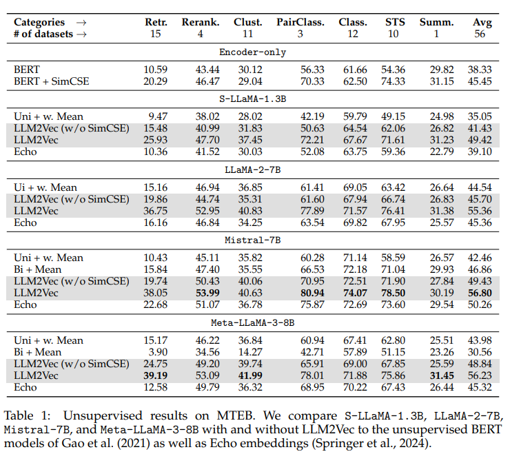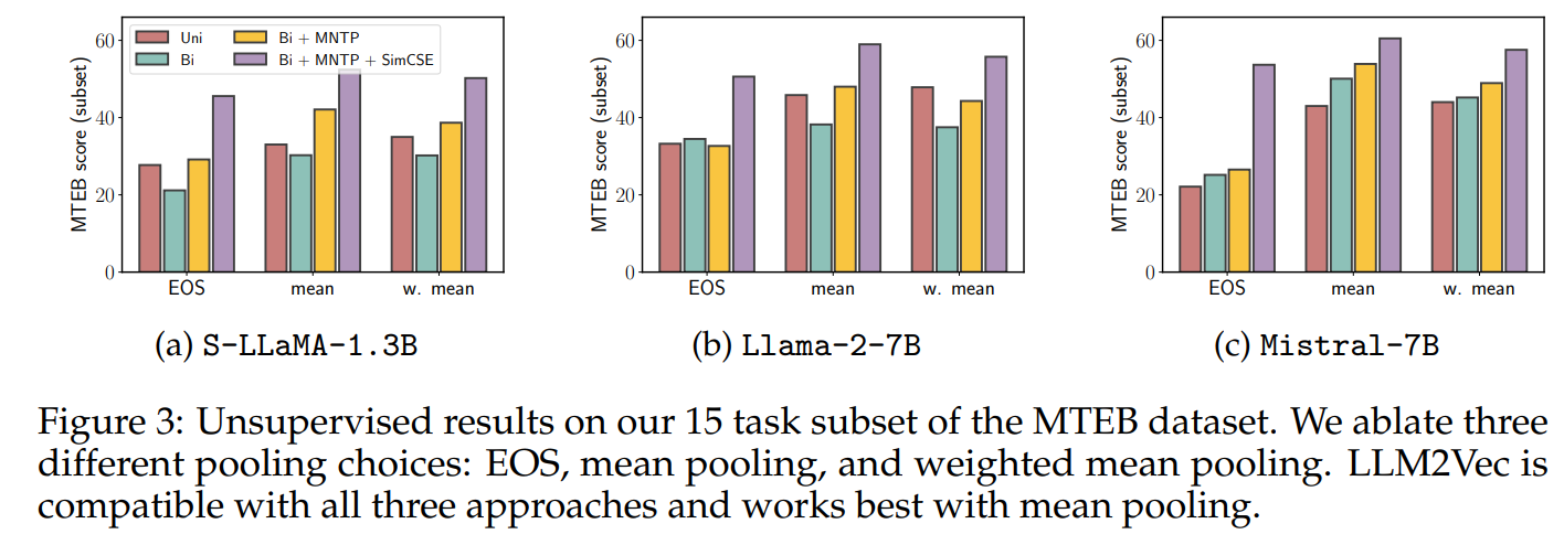 - 문장 수준 작업: Massive Text Embeddings Benchmark(MTEB)에서 LLM2Vec은 비지도 학습 모델 중 새로운 최첨단 성과를 기록하며, 검색, 군집화, 분류와 같은 작업에서 뛰어난 결과를 보였습니다. Mistral-7B와 같은 모델에서는 양방향 주의만 적용해도 성능이 크게 향상되었습니다.