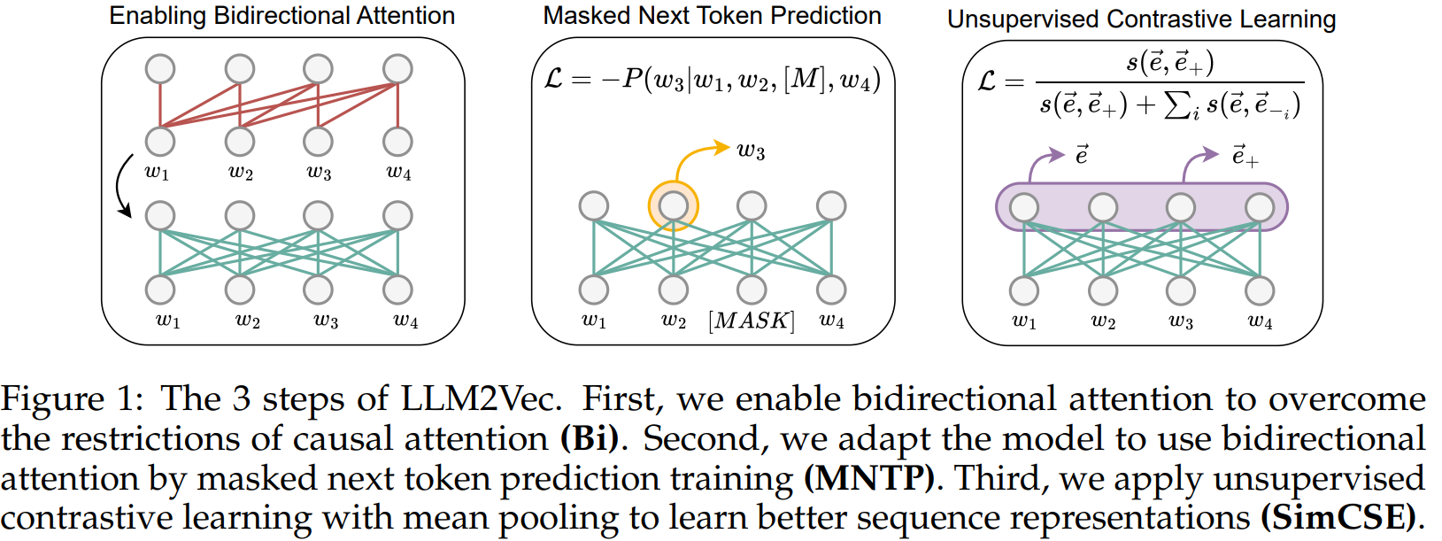 LLM2Vec은 디코더 전용 LLM을 텍스트 인코더로 변환하기 위한 간단한 비지도 학습 방식입니다. 이 방식은 세 가지 주요 단계로 구성됩니다:- 1단계: 양방향 주의 활성화: 디코더 모델의 인과적 주의 메커니즘을 제거하고 모든 토큰이 서로를 주의할 수 있는 양방향 주의를 활성화합니다.