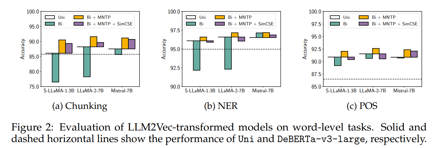| 단어 수준 작업 | 청킹, NER, POS 태깅에서 LLM2Vec로 변환된 모델들이 기존 인코더 전용 모델보다 뛰어난 성능을 보임. |